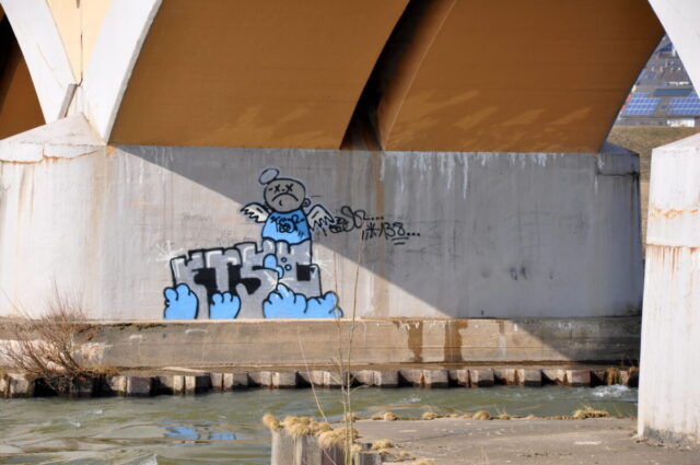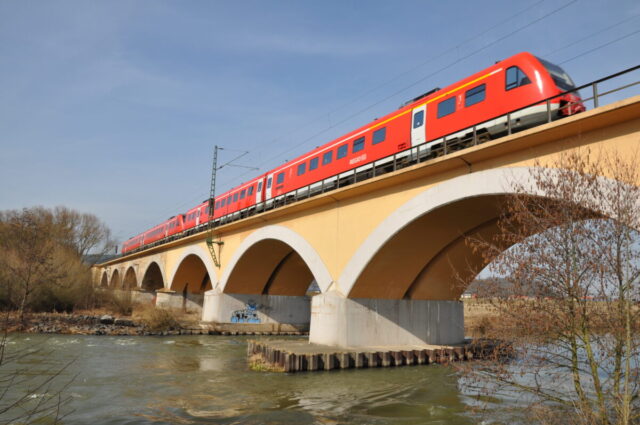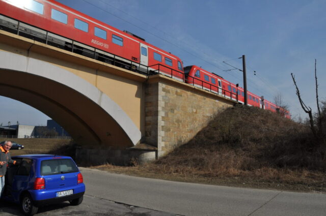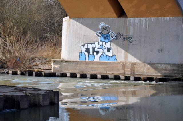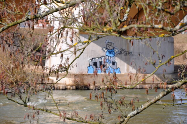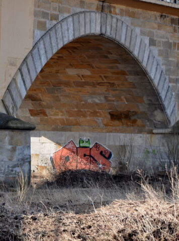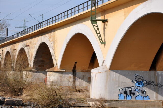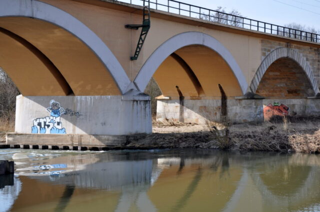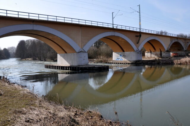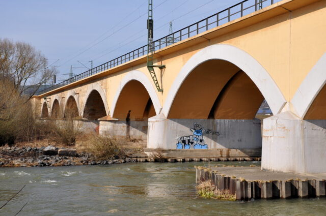 Sie ist nicht nur in ihrer Form als achtbogige Eisenbahnbrücke sehr schön anzuschauen, wie sie den Main und die Mainauen überspannt. Auch war sie immer wieder Gegenstand von Sprayern, die allerdings keine „Kunstwerke“ im engeren Sinn hinterließen. Dennoch eine reizvolle Kombination, auch mit den Weihern dahinter.