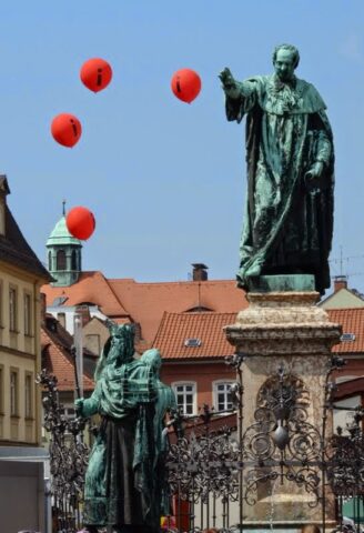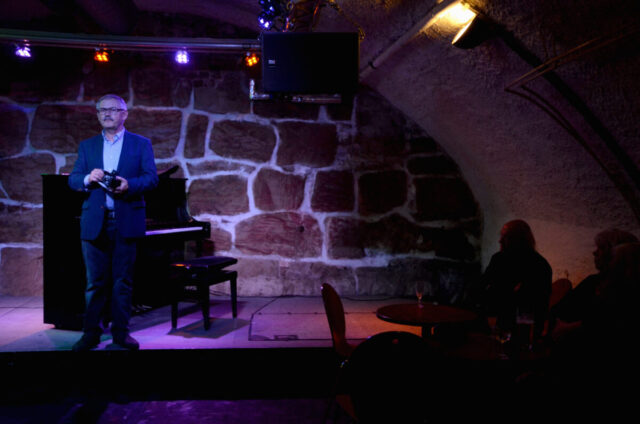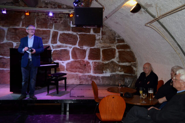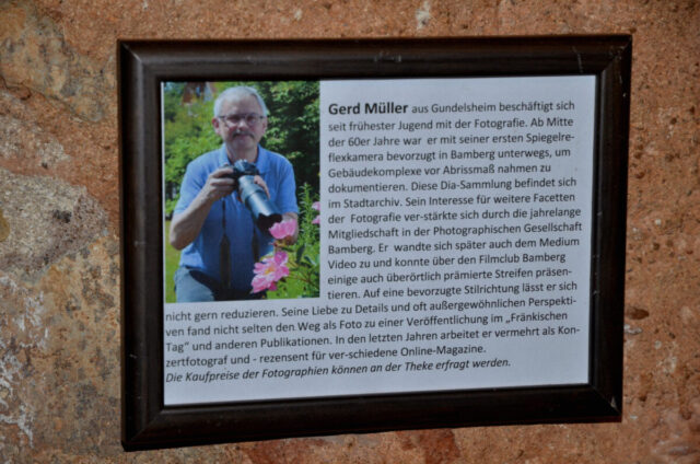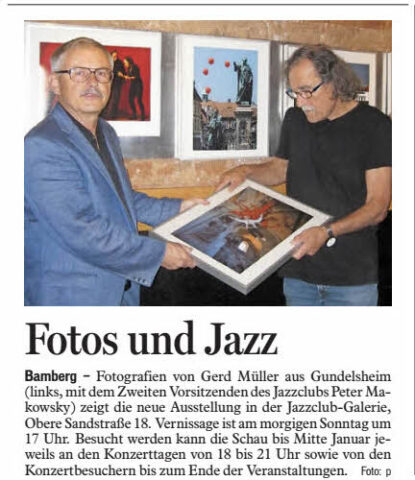Im Herbst 2013 erhielt ich überraschend vom leider am 11. Juni 2021 verstorbenen Co-Vorsitzenden des Jazzclubs Bamberg e.V., Peter Makowsky, die Anfrage, ob ich eine Fotoausstellung mit Bamberger Motiven in den Gewölberäumen ausrichten möchte. Wir kannten uns schon lange und er wusste um meine Fotoleidenschaft. Nach einer längeren Überlegungspause stimmte ich zu. Schließlich war es meine erste Ausstellung dieser Art und somit Neuland für mich. Mir stellte sich sofort die Frage, wie man mit höchstens 25 großformatigen Bildern einem Thema wie der Welterbestadt „Bamberg“ überhaupt näher kommen kann, um es fotografisch angemessen zu präsentieren – ohne sich zu blamieren. Also war das Abfotografieren von den unzähligen baulichen Schönheiten passé. Die kennen sowieso alle Einheimischen und Besucher. So kam ich auf die Idee, mehr oder weniger originelle Schnappschüsse auszusuchen und sie in den Räumen des Jazzclubs anzuordnen. Der Abend der Vernissage mit allerlei Dingen zum Knabbern und Getränken war schneller da als gedacht. Das Jazz-Urgestein Tex Döring konnte ich für die Klavieruntermalung gewinnen (wir kannten uns über die VHS seit ewigen Zeiten). Die Resonanz war größer als ich erwartet hatte! Hier ein Link auf meine Musicpage, in der ich Tex eine sog. „Juwelenseite“ widmete, die nur außergewöhnlichen Musikern und Bands zusteht.