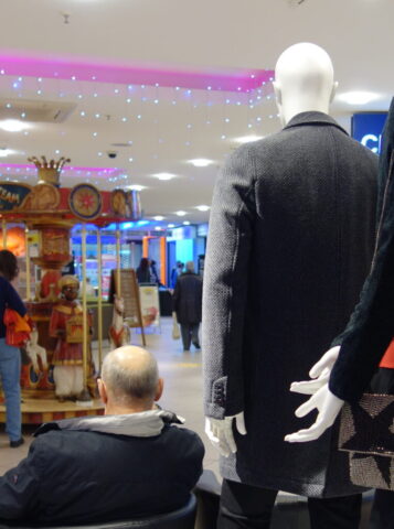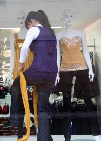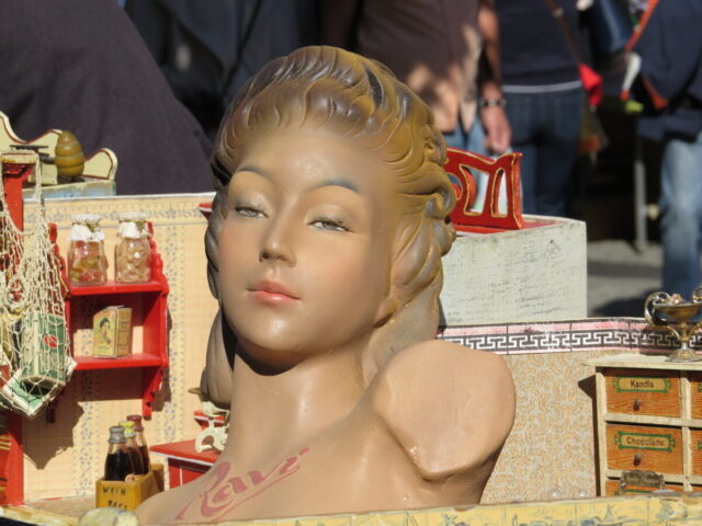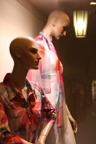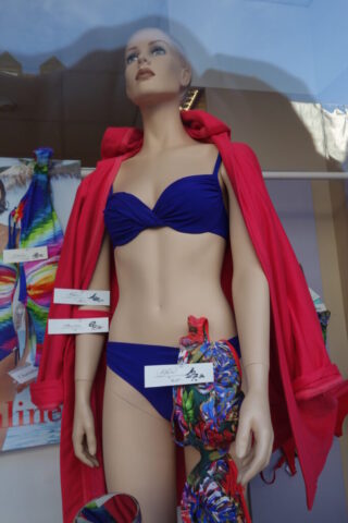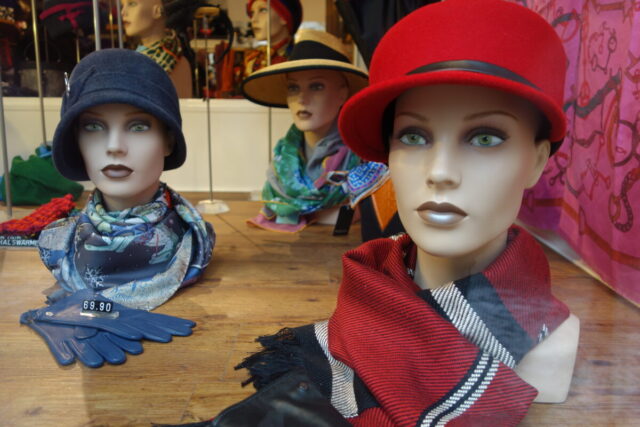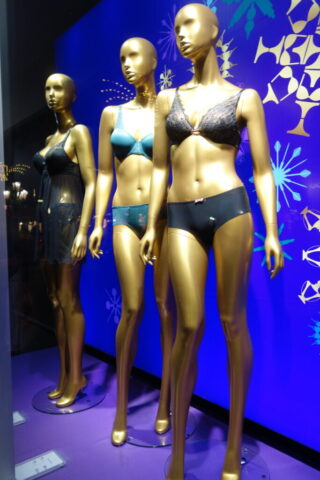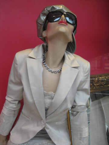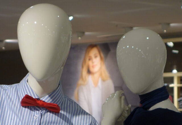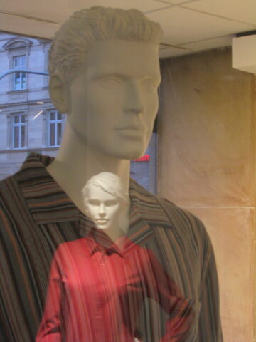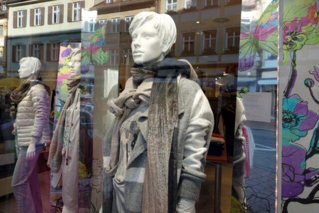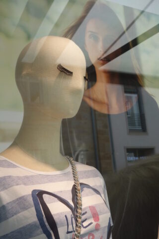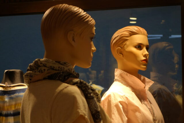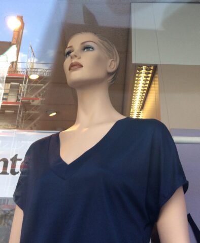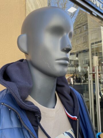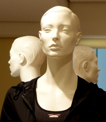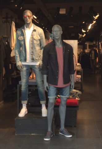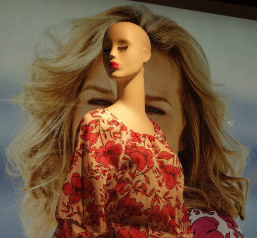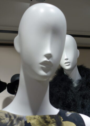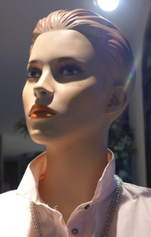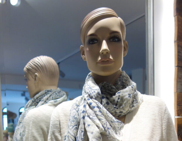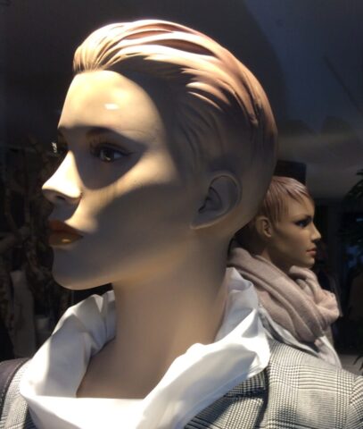 So sehen schon Gegenwart und Zukunft von Schaufensterpuppen aus: Im Gegensatz zu fast menschlich anmutenden Nachbildungen von weiblichen und männlichen Gestalten mit Echthaar sieht man nur noch oft gesichtslose billige Werbefiguren. Insofern bin ich froh, dass ich schon vor vielen Jahren mit dem Sammeln von „echten“ Models begann. Immerhin gibt es noch „Haar-Nachbildungen“.