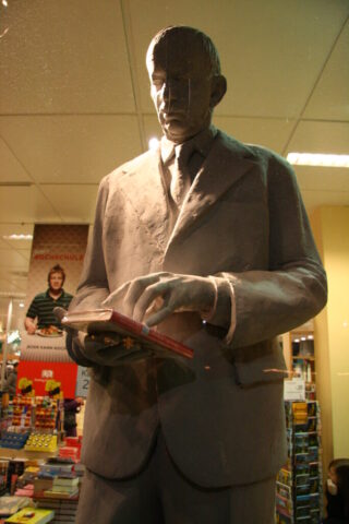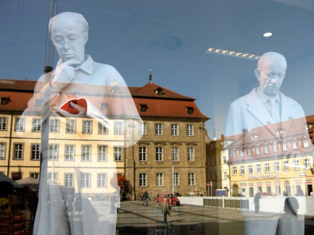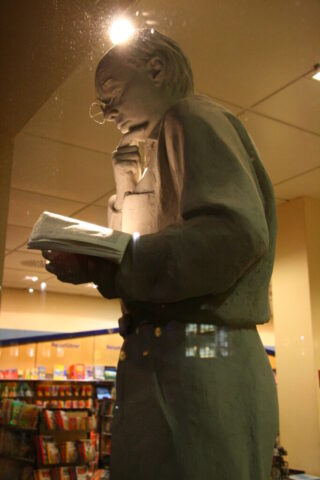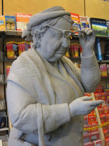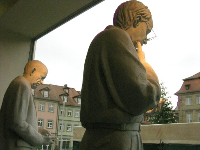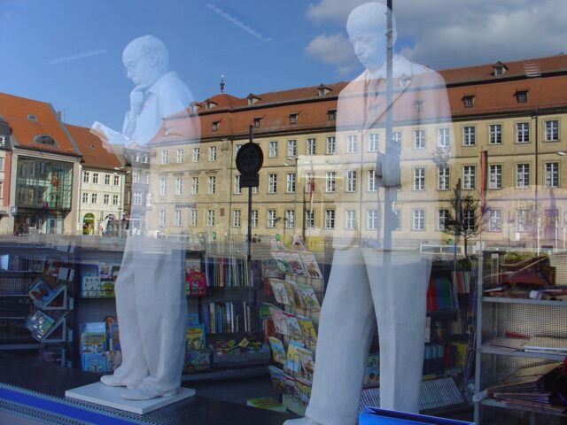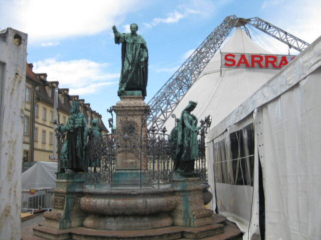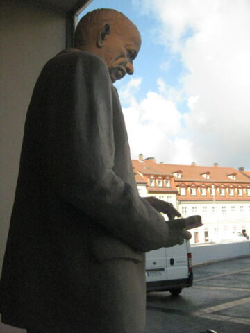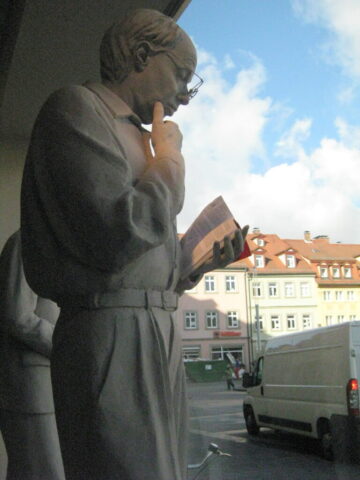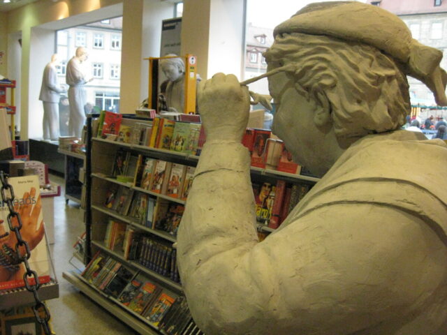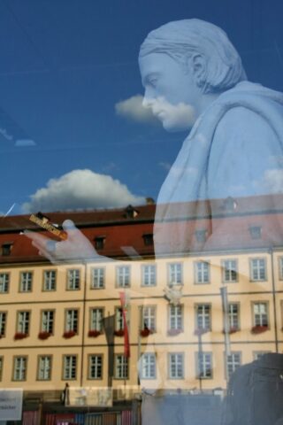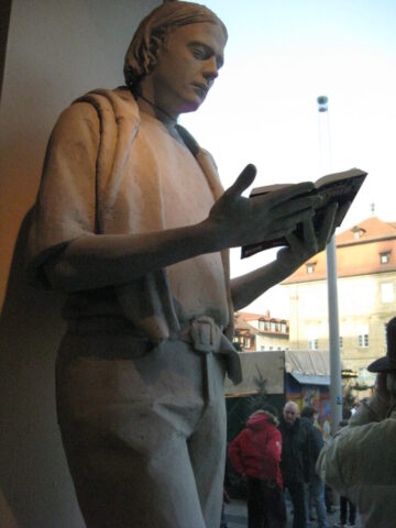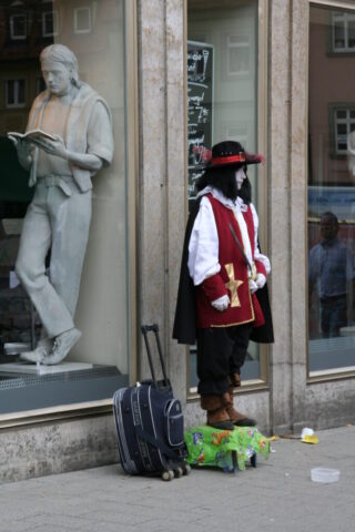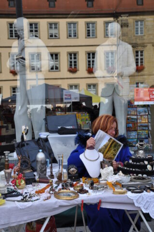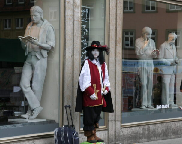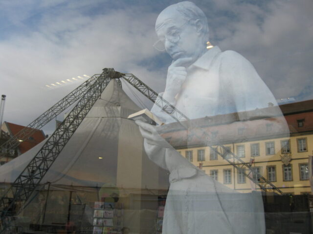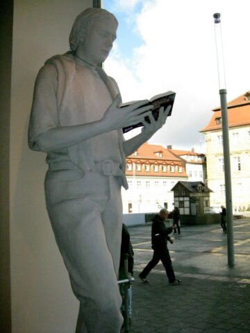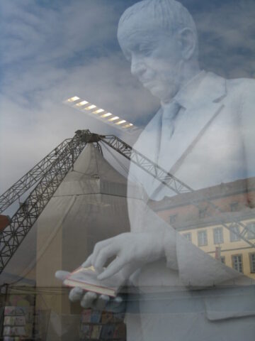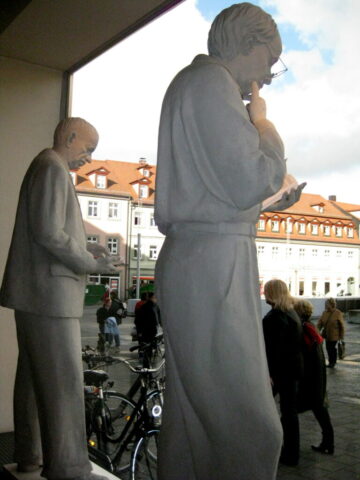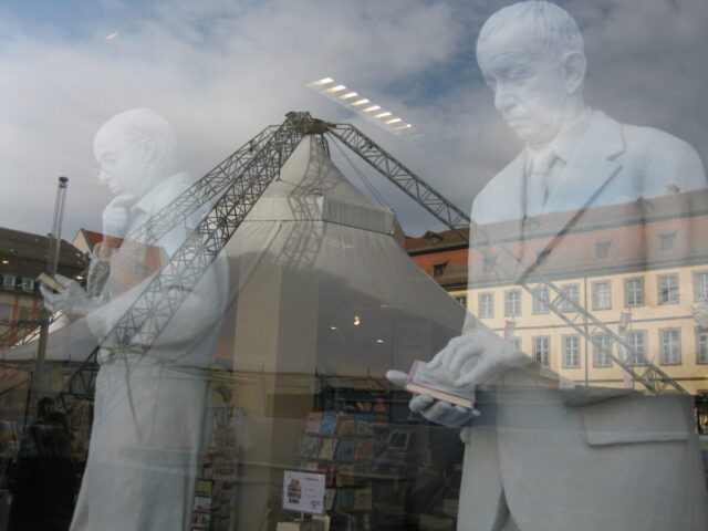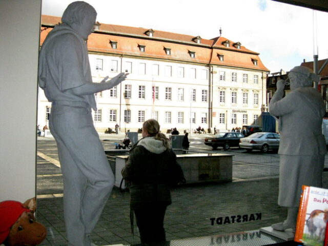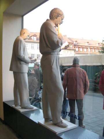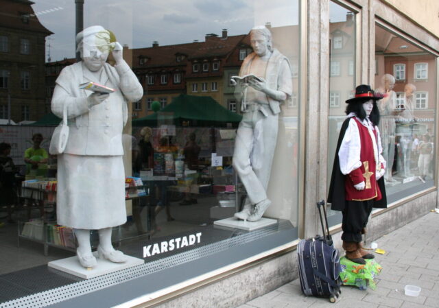 Diese „Gestalten“ waren in meinen Augen etwas ganz Besonderes. Es waren Plastiken aus festem, schwerem Material (Gips), wie man auf den Fotos sieht, als die Schwergewichte für immer abtransportiert wurden. Wohin auch immer. Zufällig war ich dabei. Sie blickten sonst lesend oder rätselnd Richtung Rathaus Maxplatz und waren für die dortige recht große Karstadt-Buchabteilung die ideale Aufforderung, einzutreten und zu schmökern. Wenn sie sich als „Geistwesen“ im Schaufenster spiegelten, war das besonders reizvoll. Die Aufnahmen entstanden 2008 sowie am 1. März 2009, als der Zirkus Sarrasani auf dem Maxplatz seine Zelte aufschlug. Es war das erste Mal, dass ein Zirkus mitten im Zentrum von Bamberg zum Besuch einlud – und sicher auch das letzte Mal wegen der damit verbundenen Umstände, auch statischer Art.