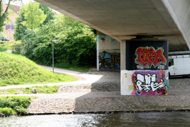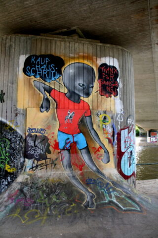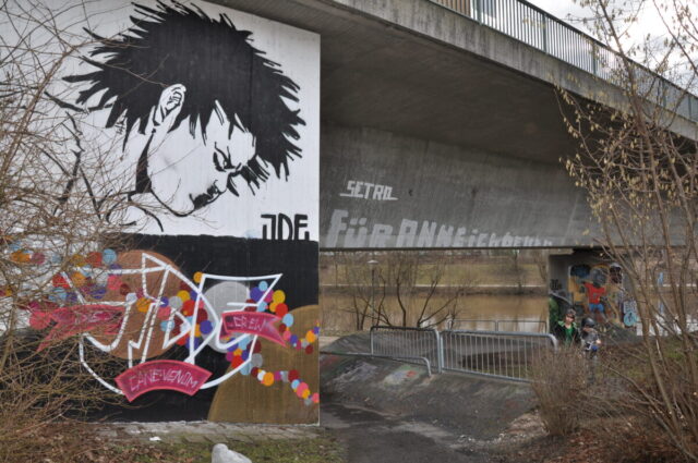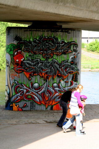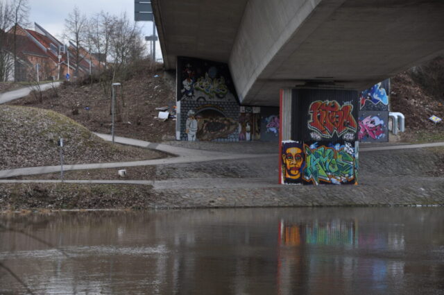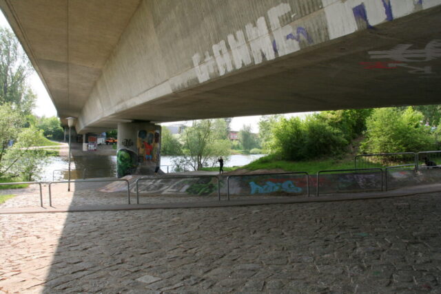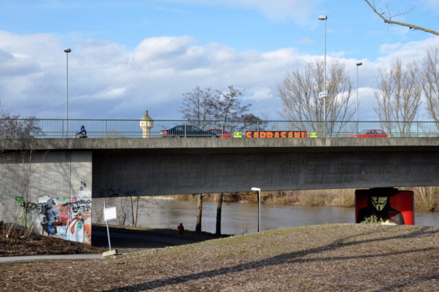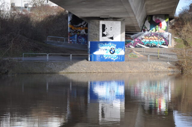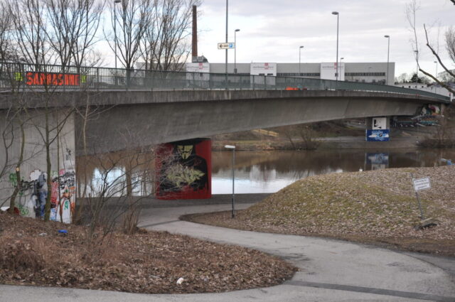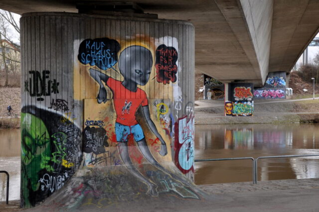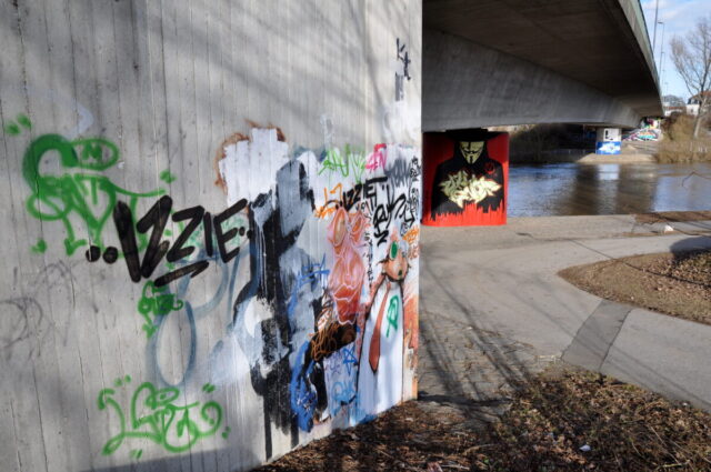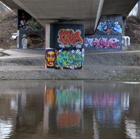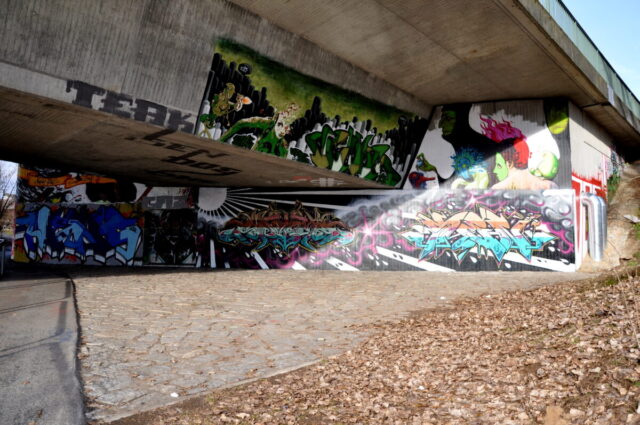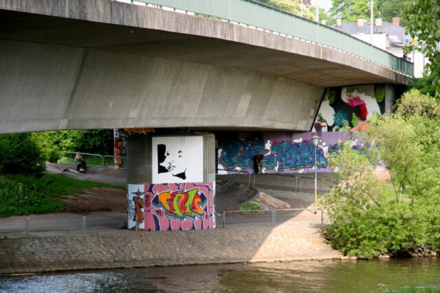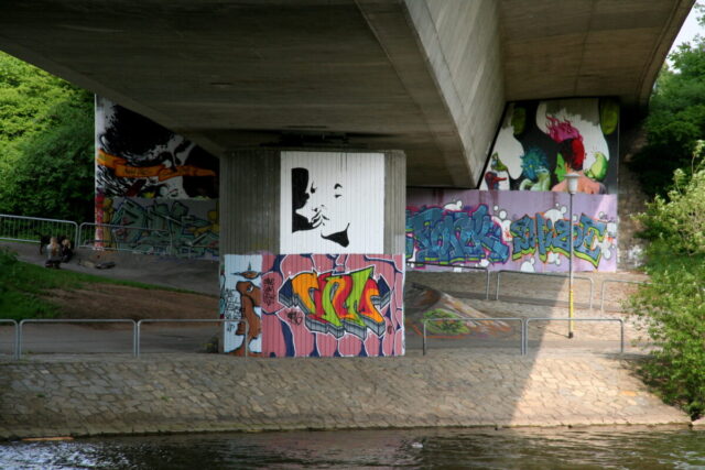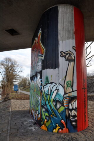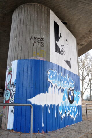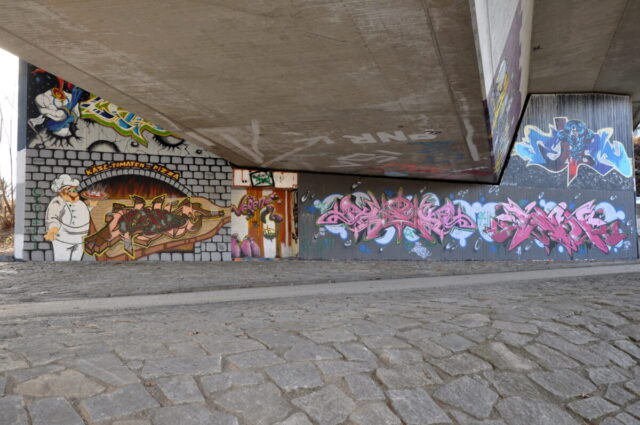 Sie führt mit einer Länge von 12o m den Regensburger Ring über den Main-Donau-Kanal. Was beidseitig unter der Brücke zu sehen ist, verdient große Aufmerksamkeit. Wunderschöne „offizielle“ Graffitis von Cane, Venom & Co., die allerdings schon mehrmals übersprayt wurden. Es wäre zu aufwändig, ständig die aktuellsten Ausschmückungen zu fotografieren. So beschränke ich mich weitgehend auf die der letzten Jahre.