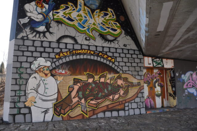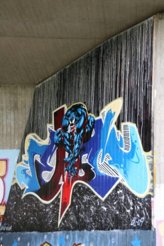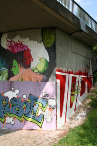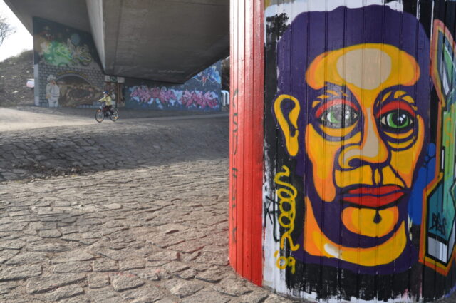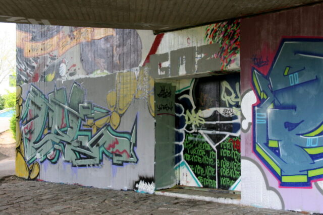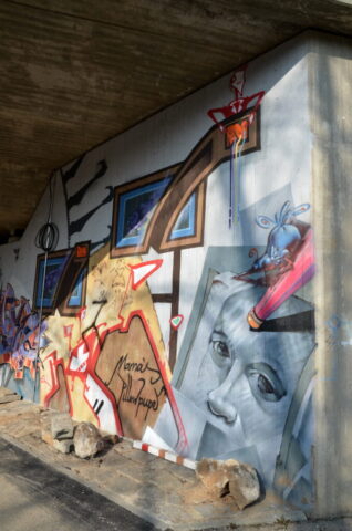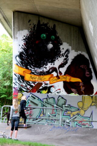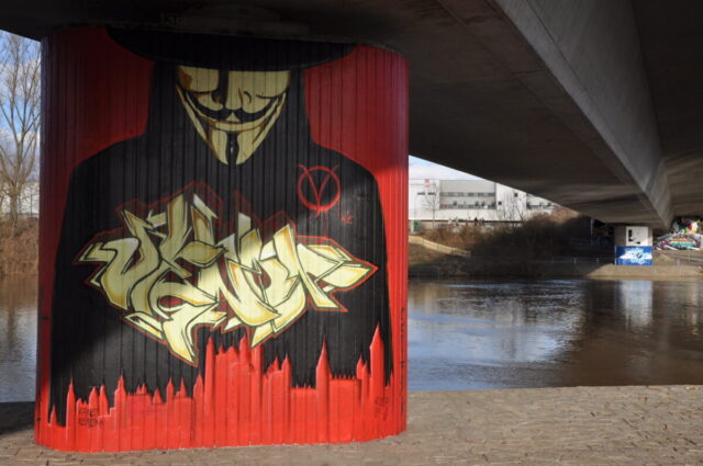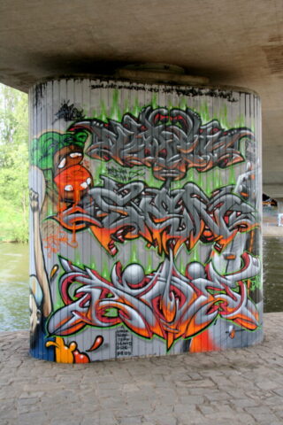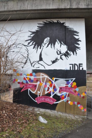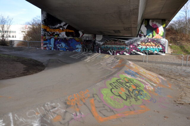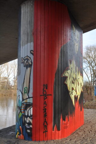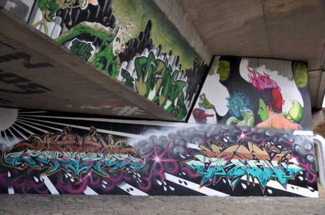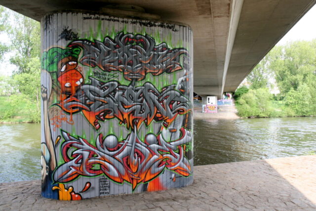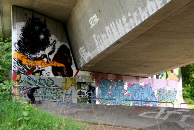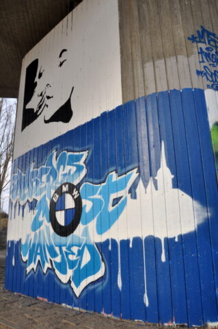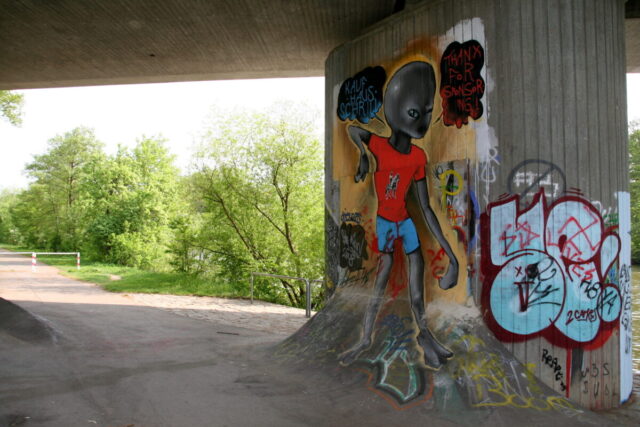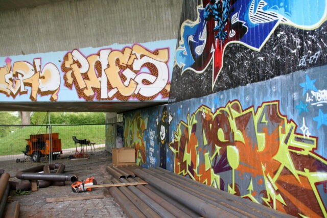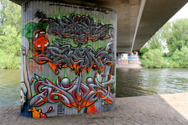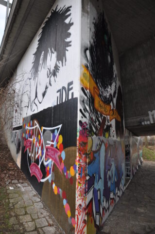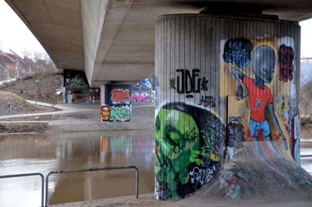 Sie führt mit einer Länge von 12o m den Regensburger Ring über den Main-Donau-Kanal. Was beidseitig unter der Brücke zu sehen ist, verdient große Aufmerksamkeit. Wunderschöne „offizielle“ Graffitis von Cane, Venom & Co., die allerdings schon mehrmals übersprayt wurden. Es wäre zu aufwändig, ständig die aktuellsten Ausschmückungen zu fotografieren. So beschränke ich mich weitgehend auf die der letzten Jahre.