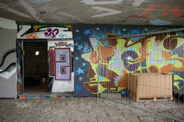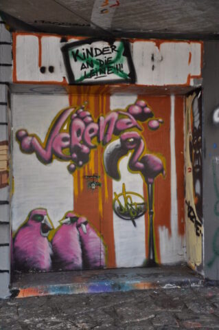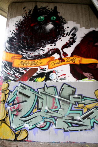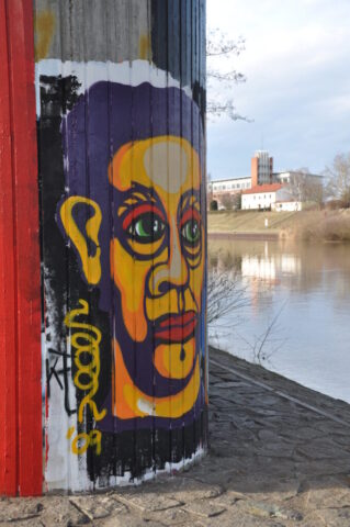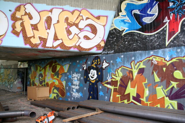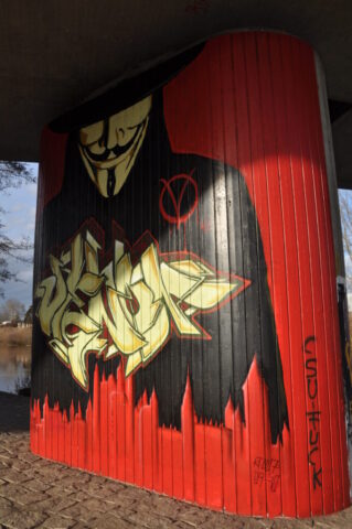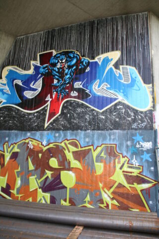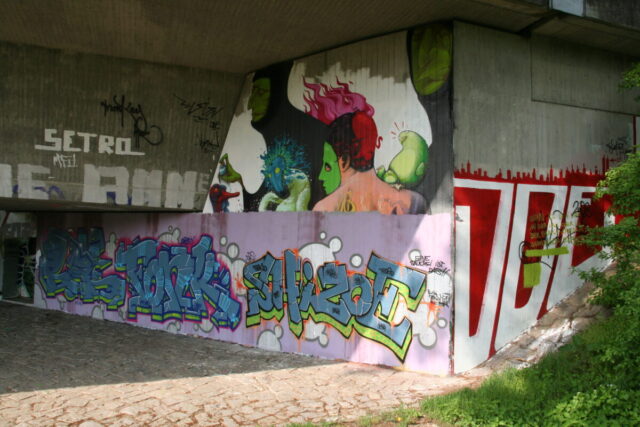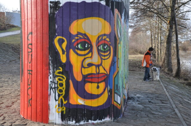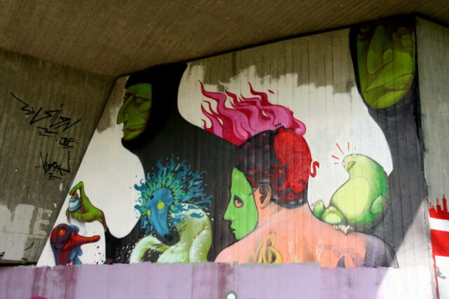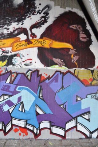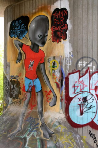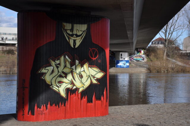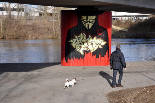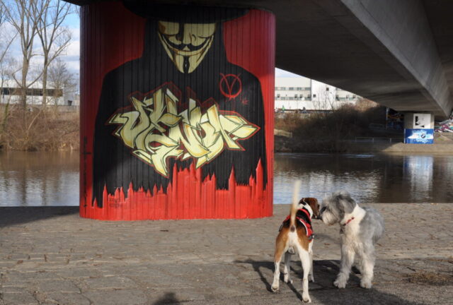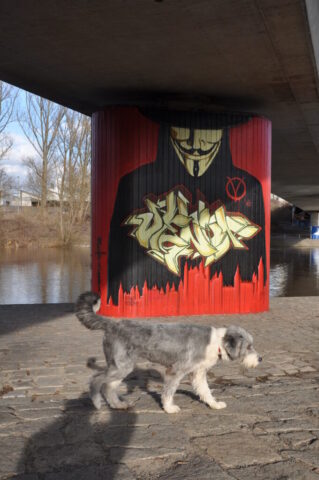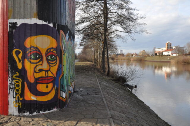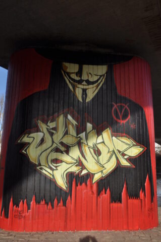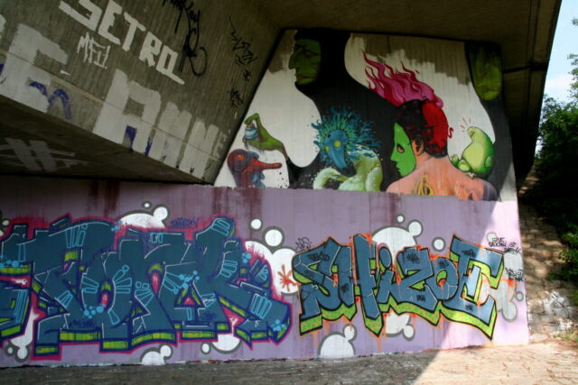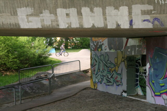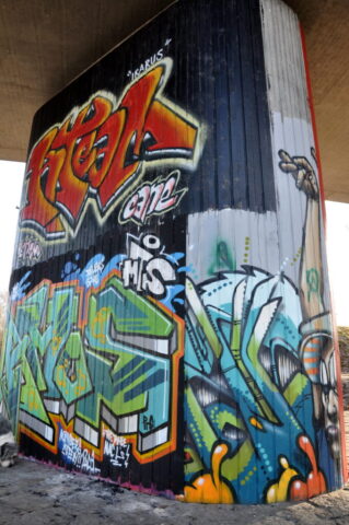 Sie führt mit einer Länge von 12o m den Regensburger Ring über den Main-Donau-Kanal. Was beidseitig unter der Brücke zu sehen ist, verdient große Aufmerksamkeit. Wunderschöne „offizielle“ Graffitis von Cane, Venom & Co., die allerdings schon mehrmals übersprayt wurden. Es wäre zu aufwändig, ständig die aktuellsten Ausschmückungen zu fotografieren. So beschränke ich mich weitgehend auf die der letzten Jahre.