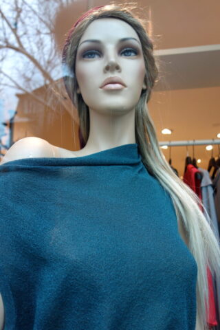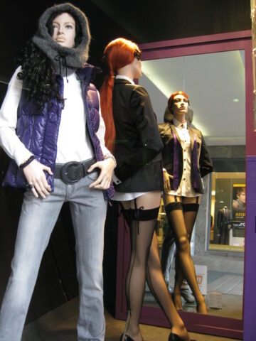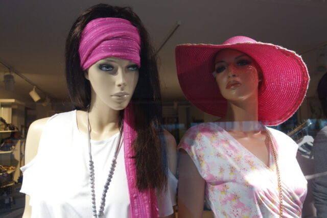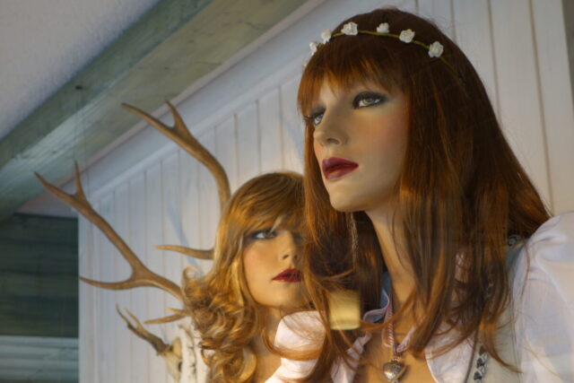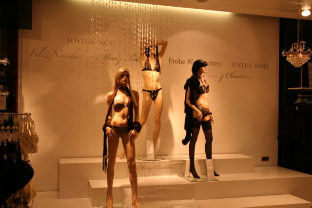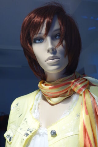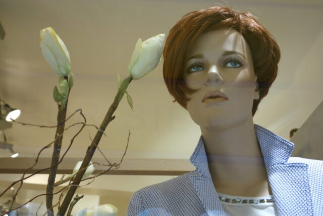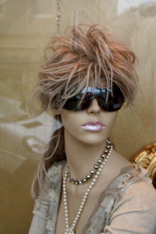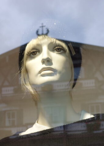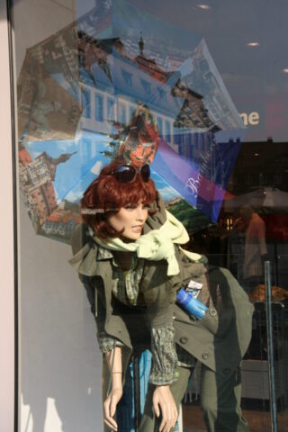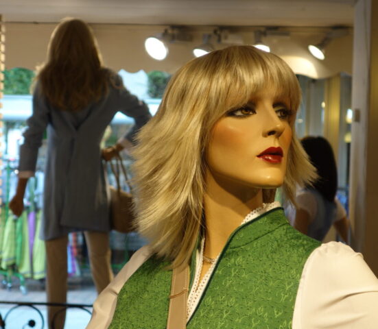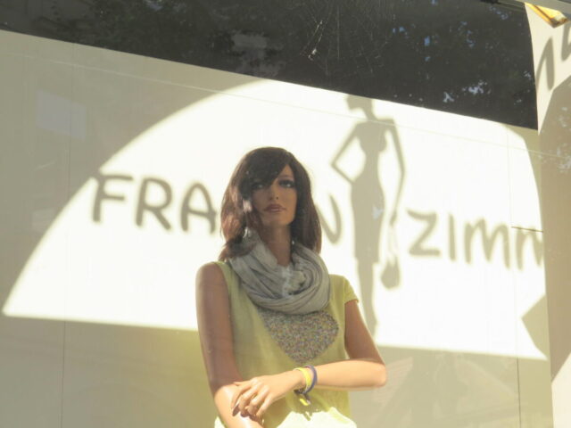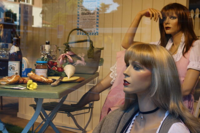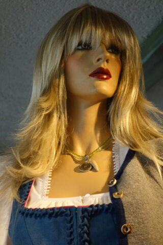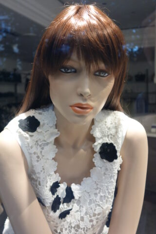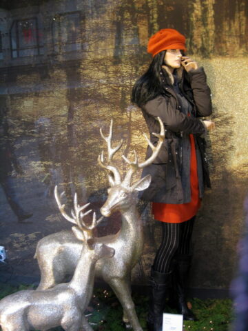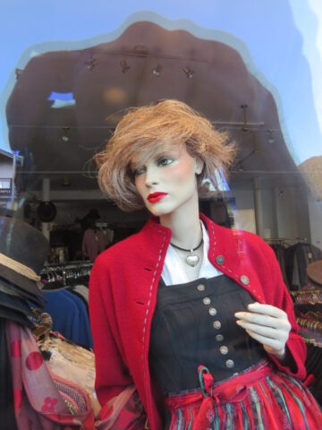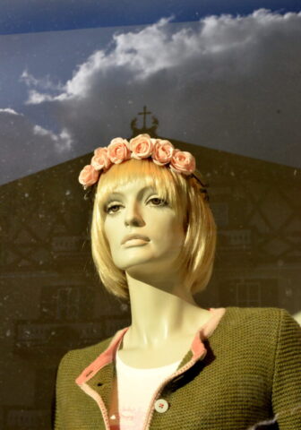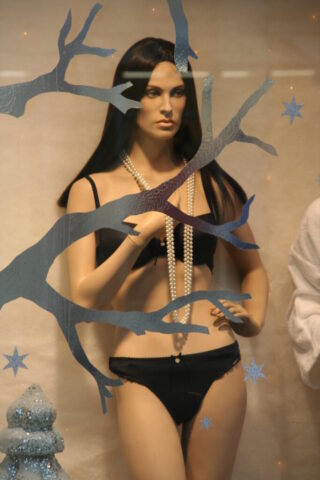 Kritik muss ich insofern anbringen, weil es kaum Schaufensterpuppen gibt, die über die mageren Modelmaße hinausgehen. Übergewichtige Personen werden kaum abgebildet. Jedenfalls bin ich froh, dass ich schon vor vielen Jahren mit dem Fotografieren dieser Figuren anfing, als noch die Natürlichkeit der Darstellung im Vordergrund stand. Und die wurden je nach Jahreszeit eingekleidet. Besonders festlich in der Weihnachtszeit. Kritik gibt es aber auch, weil meist nur weibliche Puppen für aktuelle Mode werben, seltener Männer, die bekanntlich nicht so modebewusst sind. Auch habe ich nur ein- oder zweimal eine männliche Schaufensterpuppe mit Echthaar gesehen und zwar in Rottach-Egern (vielleicht, weil Haarausfall weit verbreitet ist? *g*). Siehe ziemlich weit unten. So hat sich mein Faible für weibliche „Darsteller“ zwangsläufig entwickelt.