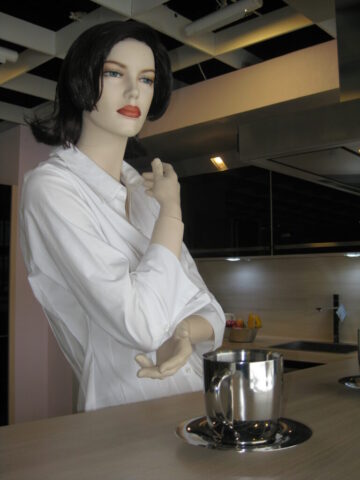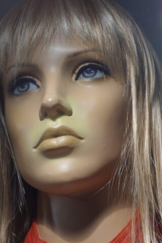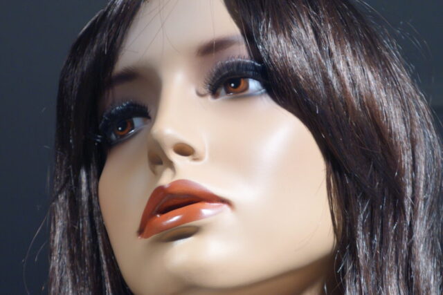 Was mich am Thema fasziniert? Es ist die Entrücktheit, Ästhetik, Makellosigkeit, Unnahbarkeit, manchmal auch Pseudo-Erotik. Der Blick in die Ferne, das Maskenhafte, oft auch die Ausdruckslosigkeit. Manche schauen stolz, manche melancholisch durch die Glasscheiben. Lächeln kommt so gut wie nie vor. Schade, dass diese „Geschöpfe“ mit fast täuschend echten Köpfen, farbigen Augäpfeln, Echthaar, Schminke usw. im Aussterben begriffen sind. Jetzt sieht man meistens nur glatte Plastik-Kugelköpfe, allenfalls mit aufgedruckten Augen und großen Wimpern oder einfach nur runde Holzkugeln. Oder nur noch Halsstummel. Sind halt auch pflegeleichter. So geht eine Dekoära zu Ende.