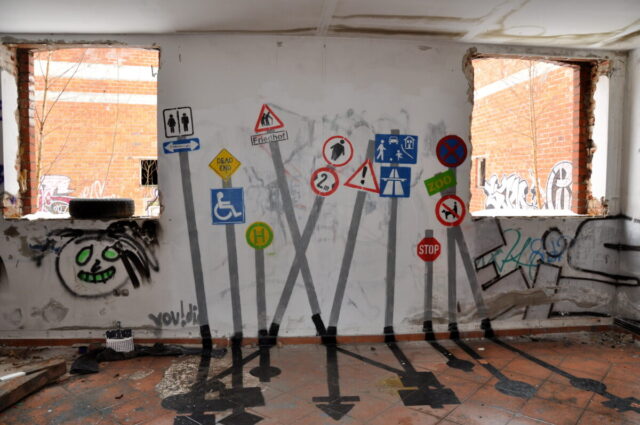 Die waren auf dem Gelände bzw. in den Räumen mit originellen Abwandlungen zu sehen. Tolle Idee, künstliche „Schatten“ auf den Boden zu malen!